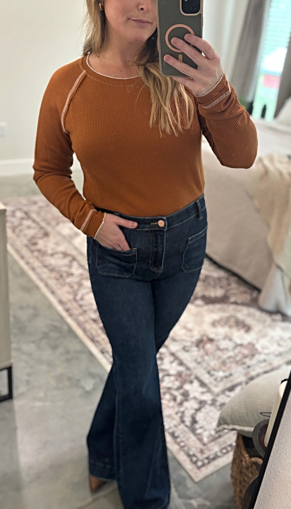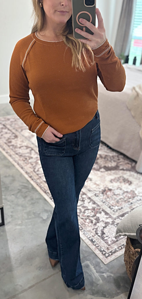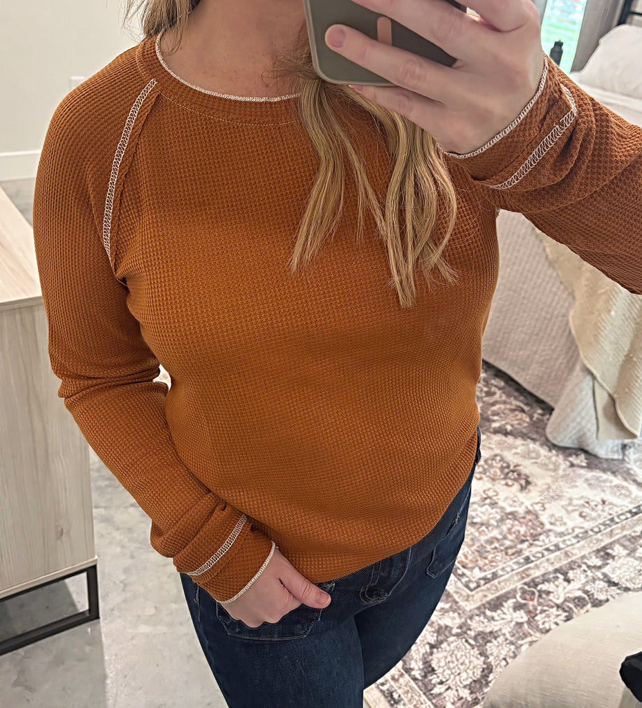 Fall inspired basic top. Comes in a beautiful rust color and a waffle texture. Perfect layering piece or dress it up with your favorite shoes and jewelry. Modeling a medium below. 5’4, 155lbs.