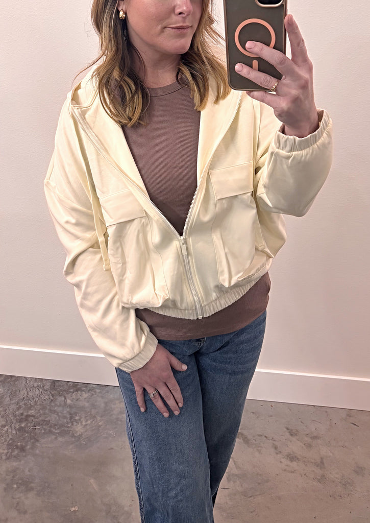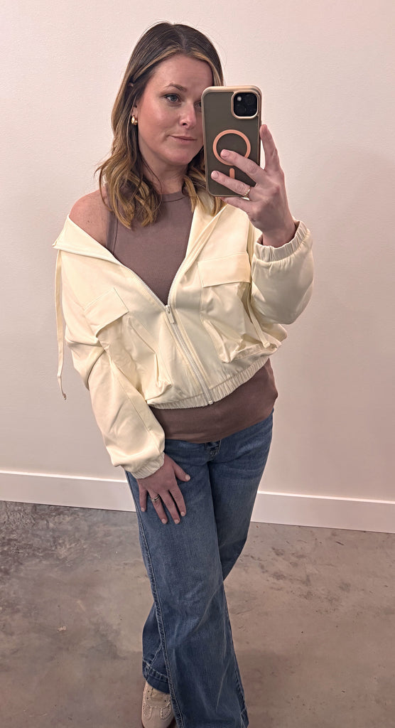 Shopping for Spring? Grab our new off white utility jacket! This piece with be perfect to layer on those mild weather days. Grab it before it’s gone!